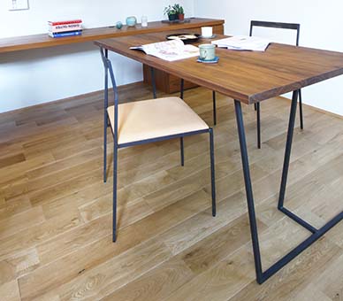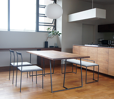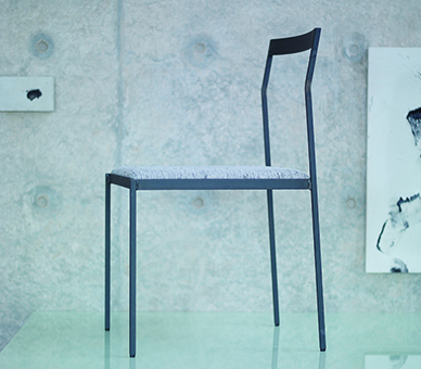 最小限の構成要素でできた、ミニマルなデザインのチェア。フレーム部分は鉄を熱してハンマーでたたいた表情と、心地よい肌触りを体感していただけます。