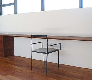 最小限の構成要素でできた、ミニマルなデザインのチェア。アーム部分は鉄を熱してハンマーでたたいた表情と、心地よい肌触りを体感していただけます。