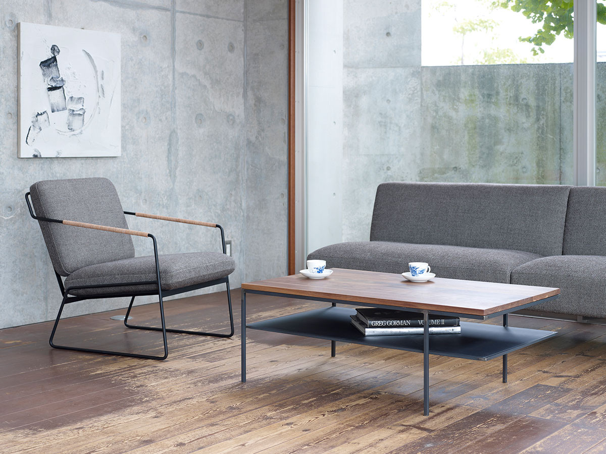 鉄だからこそ出せる浮遊感。張地は肌になじむ柔らかな質感と独特の風合いが魅力の国産の豚革などをしています。別売りのサイドテーブルを左右両サイドに取り付けられます。