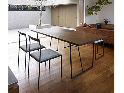 シンプルながらもディテールにこだわったダイニングテーブル。職人の手仕事が感じられます。空間をすっきりとみせる軽やかなデザインで、あわせる椅子を選ばないのも魅力です。