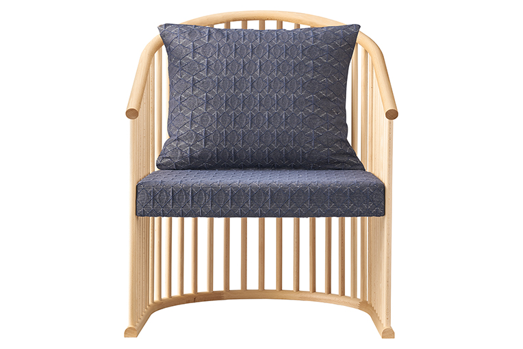 京町家では採光や風通し、防犯性から縦格子を取り入れている。その縦格子を家具に用いることで、視線や空間をゆるやかに遮りながらも抜け感がある、軽やかなラウンジチェアとなった。たくさんの人が行き交うも、プライバシーを確保したい大空間におすすめの一脚。