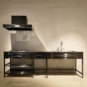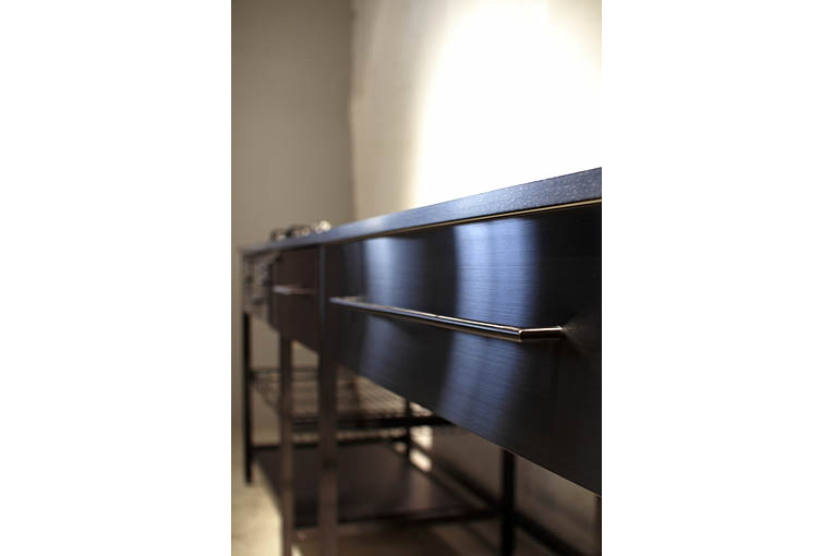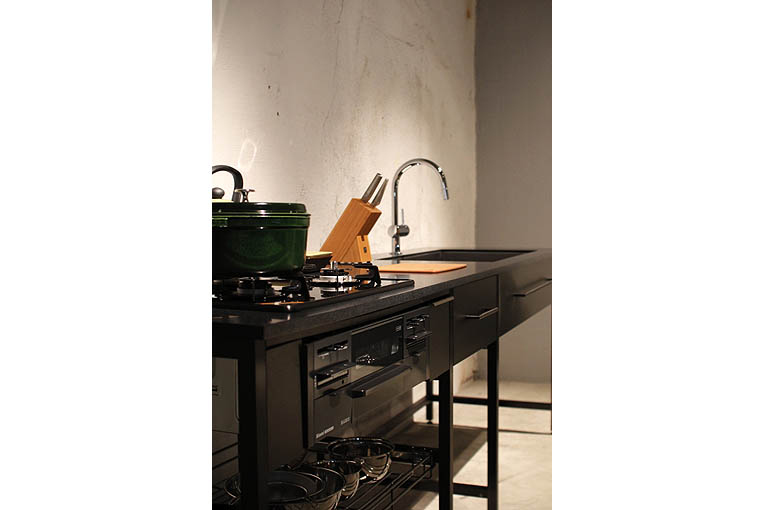 なんといってもブラックの重厚感がエレガントなキッチン。ステンレスのシャープさと、落ち着きを併せ持った、大人な印象のキッチンです。