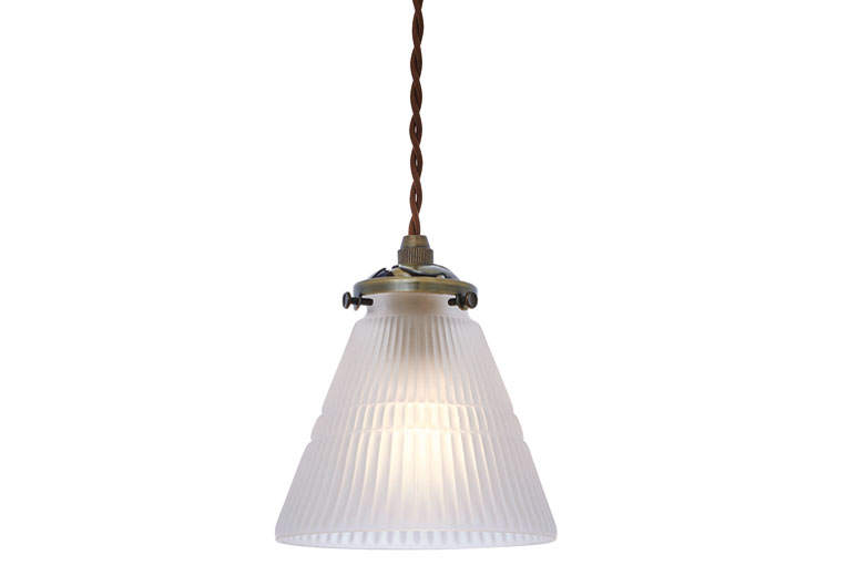 細やかな縦線をあしらった円錐フォルムのガラスセードから美しい光の反射が楽しめるペンダント照明。