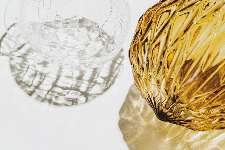 ガラスの凹凸に光が溜まり、宝石のように輝きます。