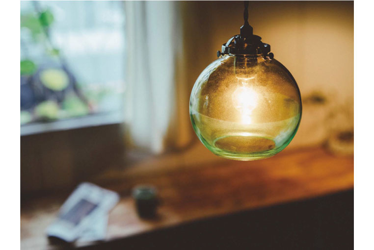 透明のまあるいガラスに上と下で異なる色づけをしてなんともレトロでかわいい印象のペンダント照明にしました。