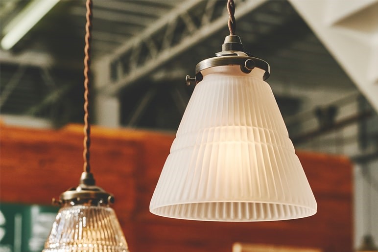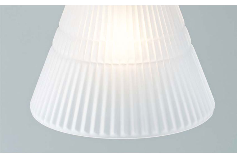 細やかな縦線をあしらった円錐フォルムのガラスセードから美しい光の反射が楽しめるペンダント照明。