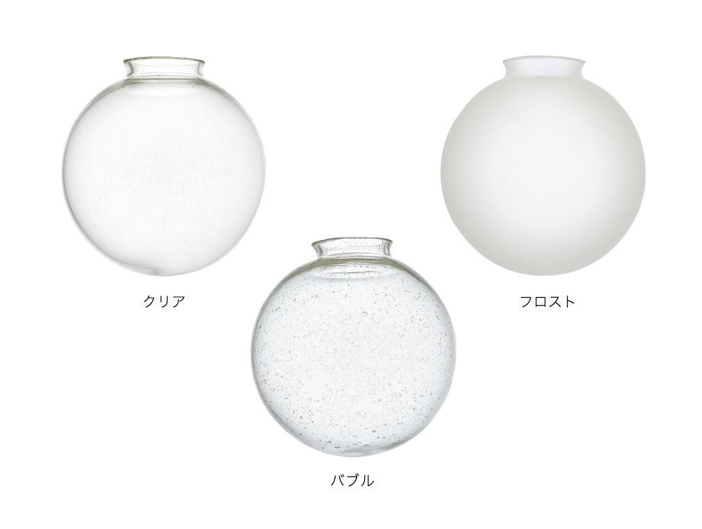 ガラスセードはミニマルな構造が際立つ[クリア]、気泡を閉じ込めたロマンティックな[バブル]、くもりガラスで目にもやさしい[フロスト]の3種類からお選びいただけます。