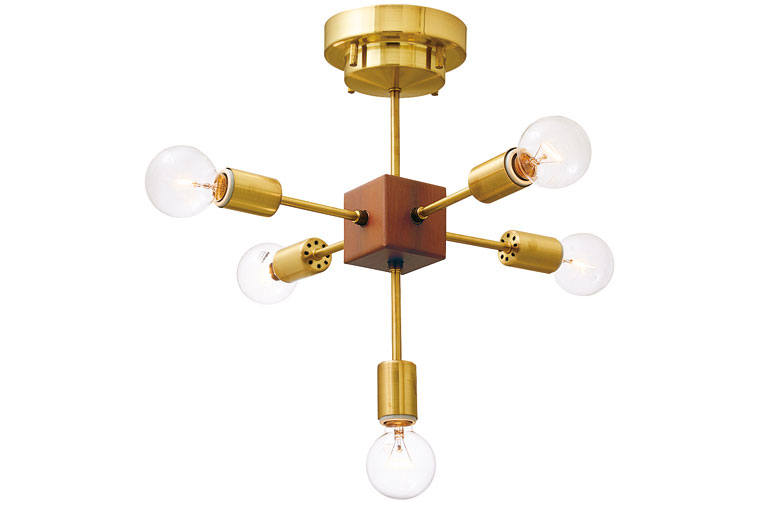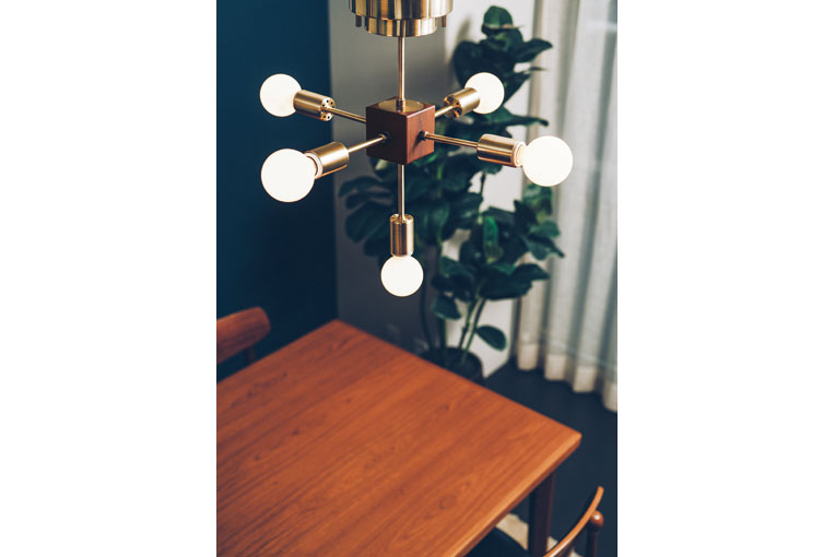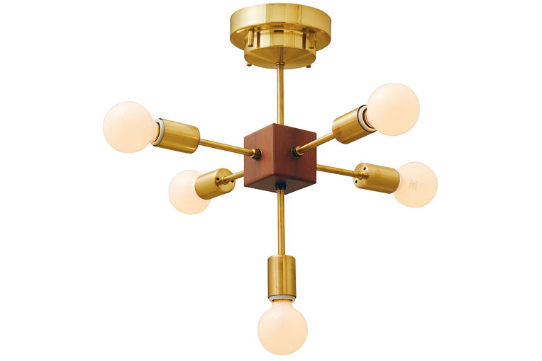 ウッドパーツが映えるゴールドカラーと上下左右前後と伸びたアームが天井をスッキリ、でもアクセントもプラス。