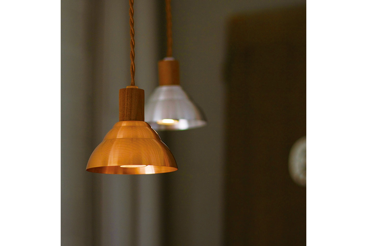 木とアルミのコンビネーションが目を引くペンダントライトです。