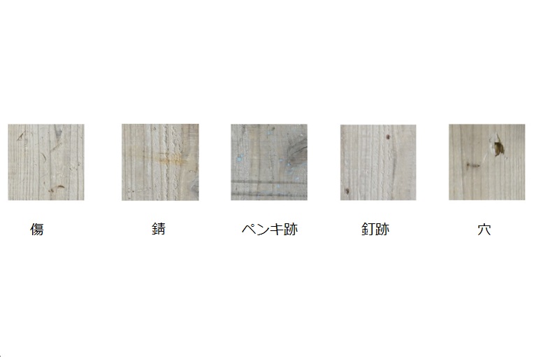 上記画像のように、個体ごと反りの大きい物や釘穴等が含まれ、抜け節や割れ・欠損部が入る場合、ささくれやとげが出ている場合があります。(金属探知機にて釘や金物処理を行いますが、まれに残っている場合がありますので事前にご承知の上、ご了承ください。品質管理を行いますが、古材・不燃未処理のため、まれに虫が出る場合があります)