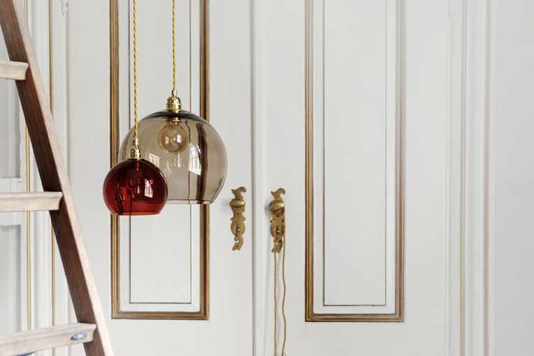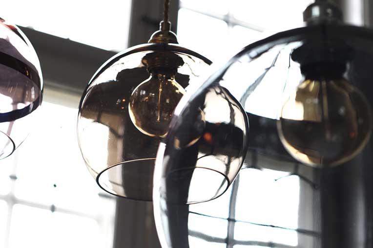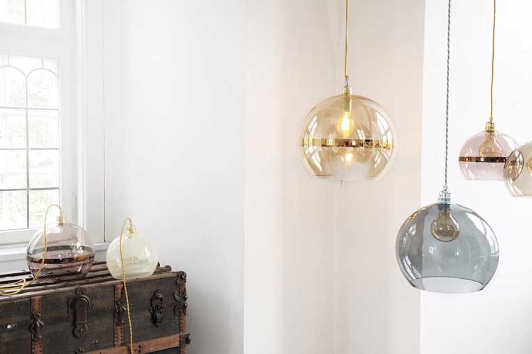 金属と口吹きガラスを使ったシンプルなデザインとモダンなディテールに絶妙な色の深みを融合させています。