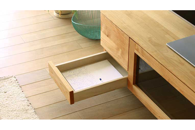 下段はA4ファイルが収納できるサイズの浅めの引出し。AV機器の保証書や説明書などの保管スペースとしてご利用いただけます。