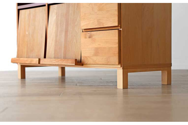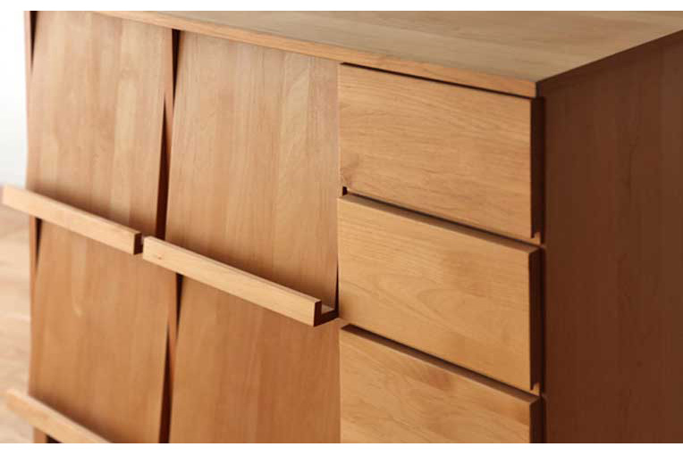 前板・扉の取っ手部分にはアルダー無垢材、天板・側板にはアルダー突板を使用し天然木の素材感溢れる仕上がりとなっています。