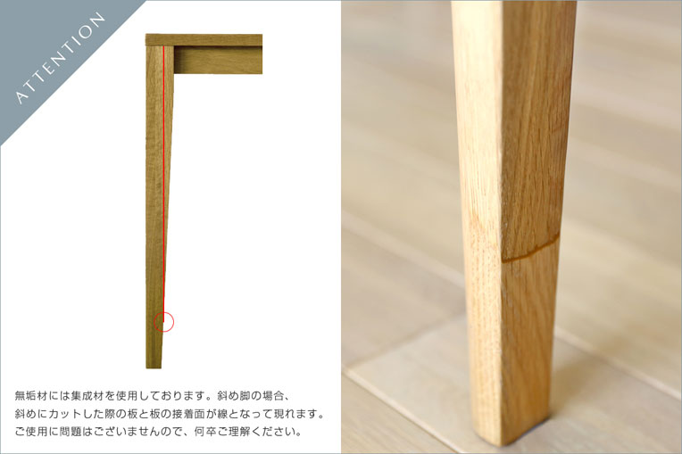 無垢材には集成材を使用しております。斜め脚の場合、斜めにカットした際の板と板の接着面が線となって現れます。ご使用には問題ございませんので何卒ご理解の程お願いいたします。