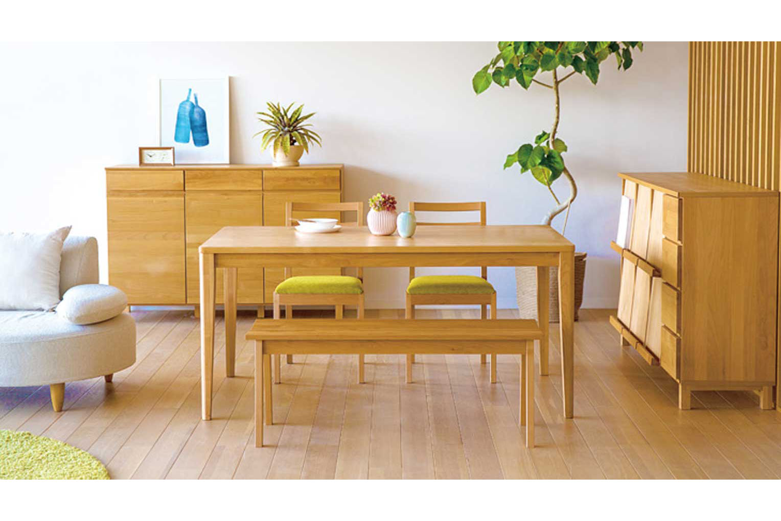 飽きのこないシンプルなダイニングテーブル。オーソドックスなデザインで、ほっとするような天然木のぬくもりが暮らしの中に広がります。
