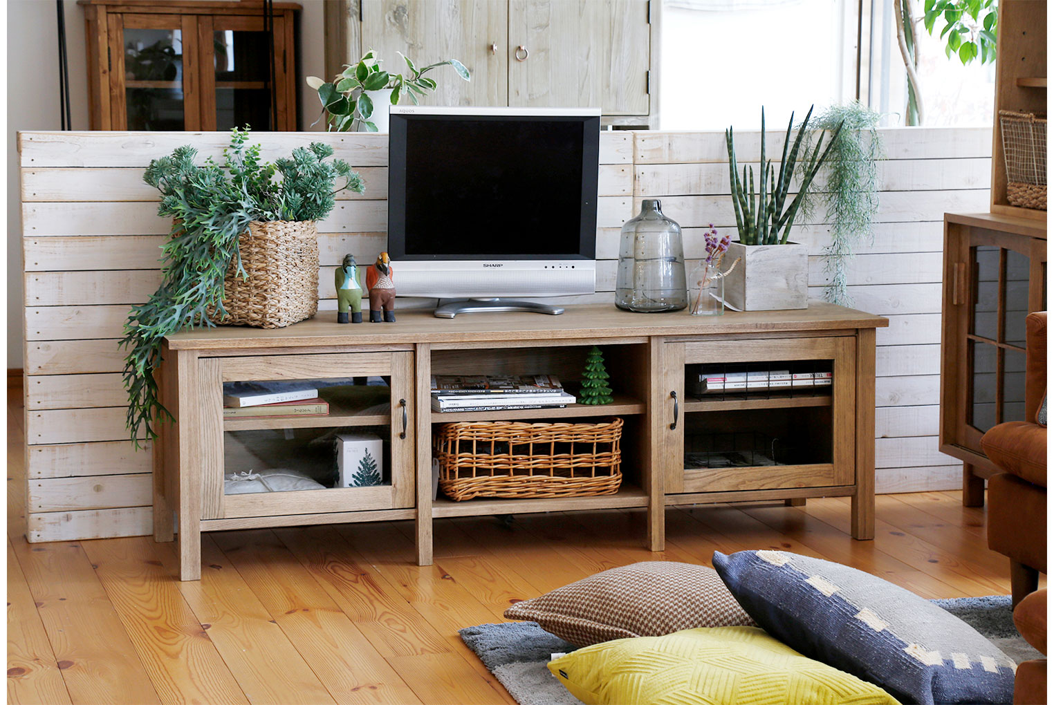 アッシュ材を使用したデザインが特徴のテレビボード。可動棚は3枚付きのため収納するものに合わせて高さが調節できます。また天板には壁付けできるコード逃がしの隙間もあり便利です。中にも配線口があり、コードを逃がすことができます。