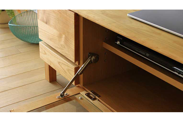 扉の内部にはAV機器収納に適した広々としたデッキスペースを設けました。移動棚・3cmピッチの5段階調整が可能です。フラップ扉にはスローダウンステーが装着されていますので、手を離してもゆっくり開きます。勢いよく開くことがないため安全です。