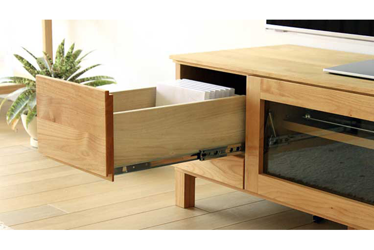 天板・側板は天然木突板仕様。中央のガラス扉、両サイドの引出しには掘り込み式の取手を採用しているため開閉もスムーズ。