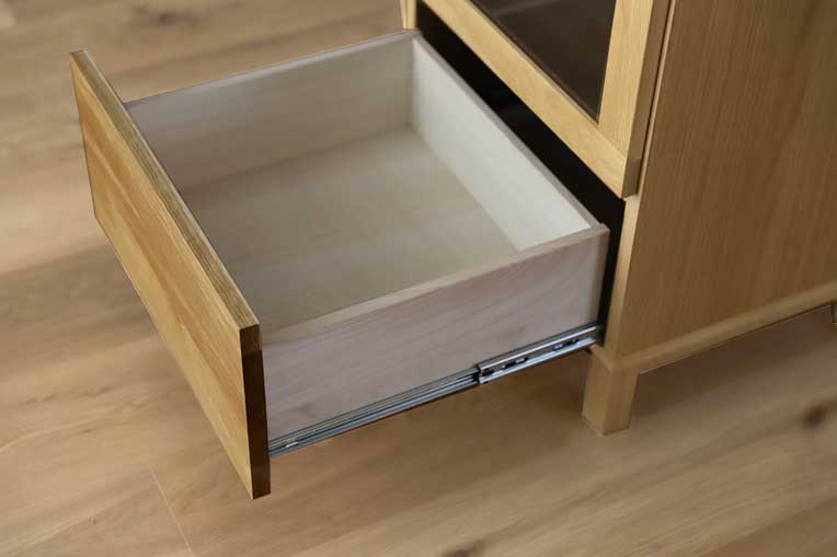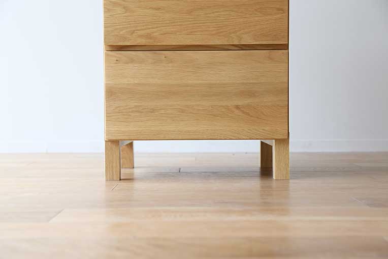 前板には無垢材、天板・側板には突板を使用し天然木の素材感溢れる仕上がりとなっています。