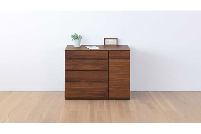 | 素材 | (天板)アルダー/ウォルナット (表面材)アルダー/ウォルナット突板 (引き出し前板)アルダー/ウォルナット無垢材 (側板)プリント化粧合板 |