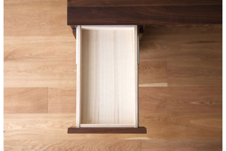 機能性はもちろん、取っ手を引出しの前板に掘り込むことで、装飾を省いたスッキリとした印象を演出しています。