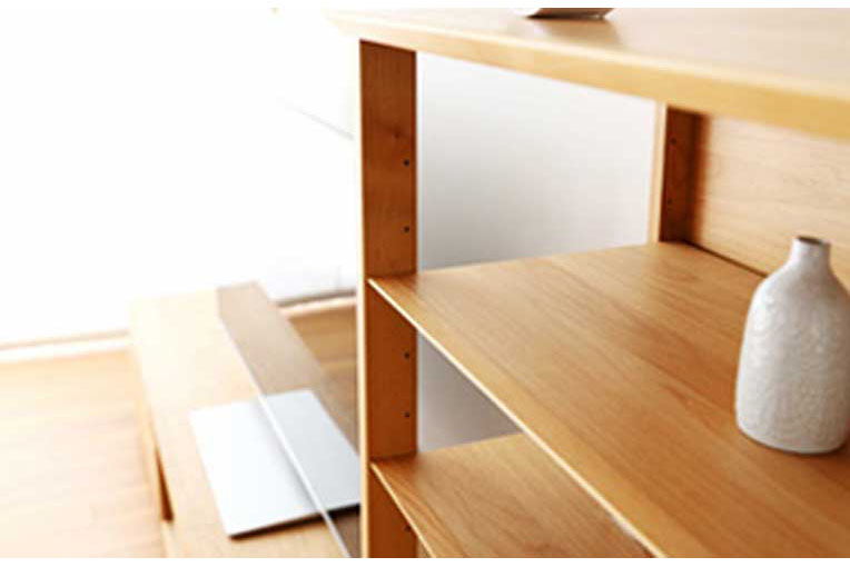 天板・飾り棚の小口は斜めカットでシャープなデザインに。移動棚は6センチピッチで11段階の高さ調節が可能です。