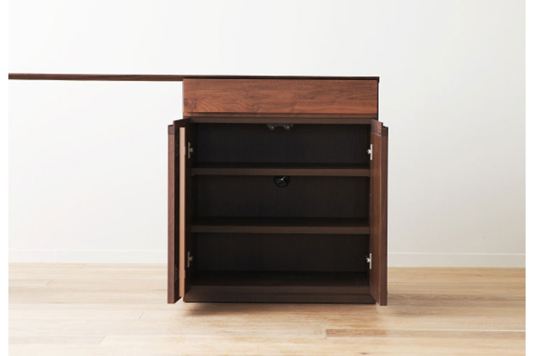 配線孔、取り外しや高さ調整が可能な移動棚など、さまざまな用途を考えて設計された60キャビネット。背面の配線孔により、テレビやAV機器の説明書やPC周りのプリンターなどの機器の収納にも最適です。