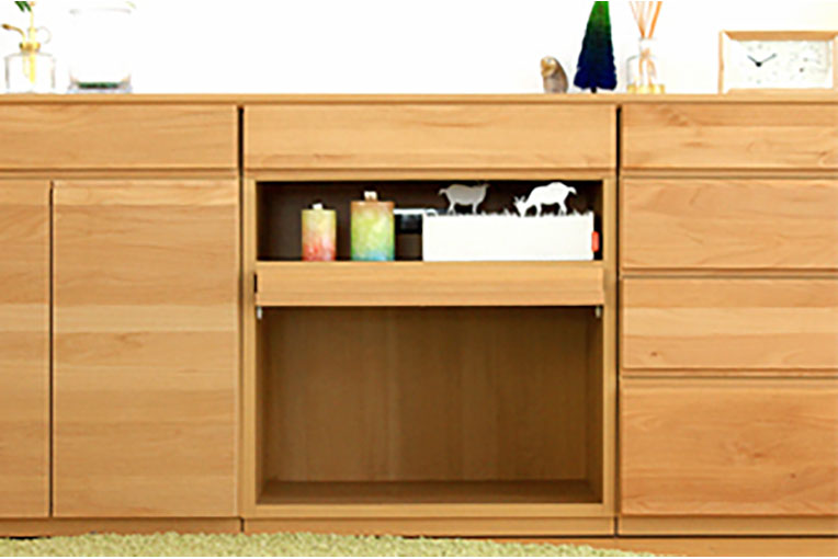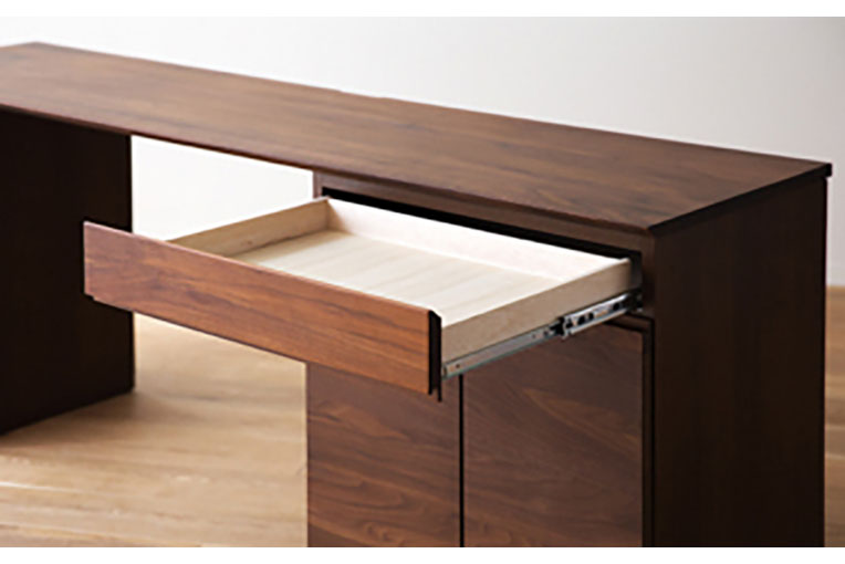 引き出しの前板、扉の取っ手には無垢材を贅沢に使用。天然木ならではの素材感は安価なプリントでは出せない質感です。引き出しにはスライドレールを採用しているので開閉も楽々。