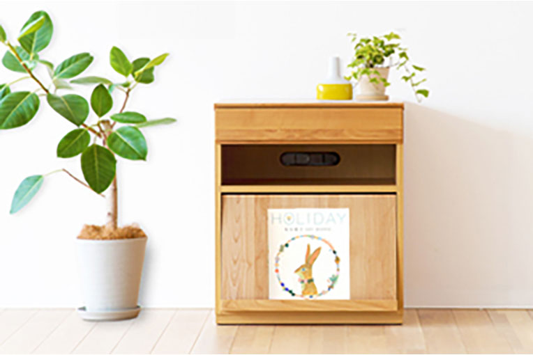 扉を閉めて雑誌を飾るか、開けて本を収納するか、収納スタイルはお好み次第。フラップ式の扉の取手は無垢材で仕上げているため、素材感はもちろん、下方向に掛かる荷重も強度は十分。