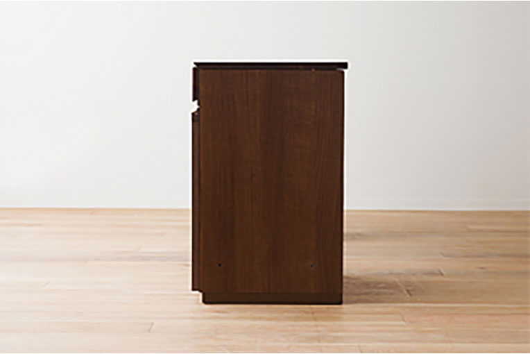 組み合わせて使うことを想定し設計された側面と背面部は、プリント化粧合板を使い綺麗に仕上げています。こうした材質を使いそのままにコストを軽減し、お求めやすい価格を実現しています。
