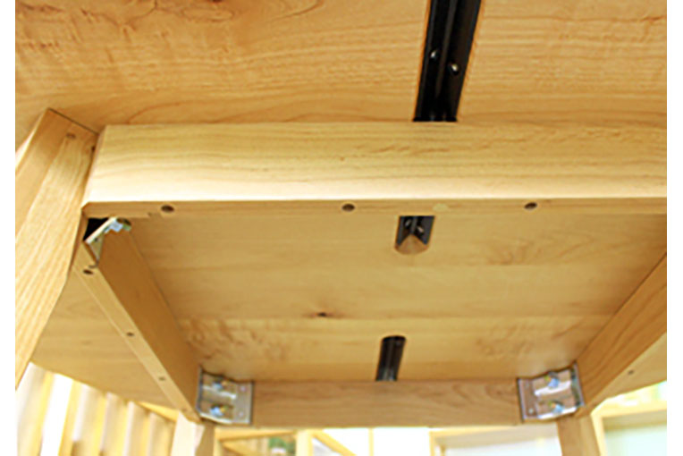 天板裏には天然木の反りや割れを防ぐ反り止め金具を装備しています。また、厚めの幕板でしっかり補強を行いガタツキぐらつきを防ぐ効果もあります。