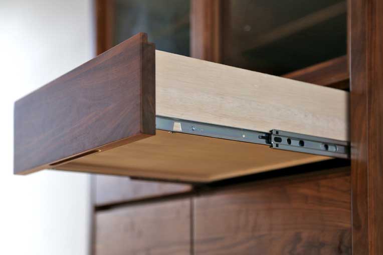 中央部の引き出しにはフルオープンスライドレールを装備。スムーズに開閉できる引き出しには浅めの作りで、スプーンやフォークなとのカトラリー類もまとめやすい仕様です。