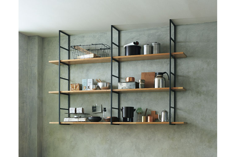 ハシゴ状のフレーム金物を壁面に固定し、数枚の無垢集成材を渡して使う収納です。