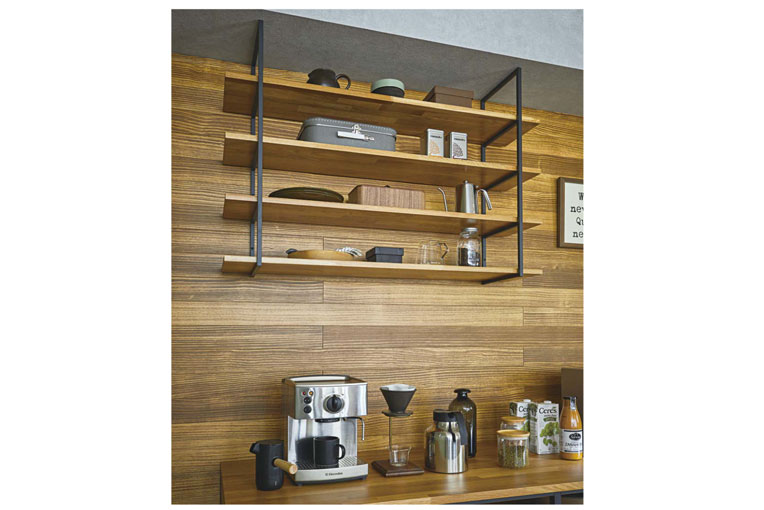 【鉄と木を組み合わせた壁面収納】壁面に圧迫感なく後付けできます。