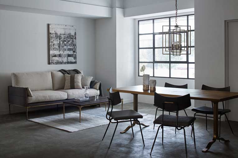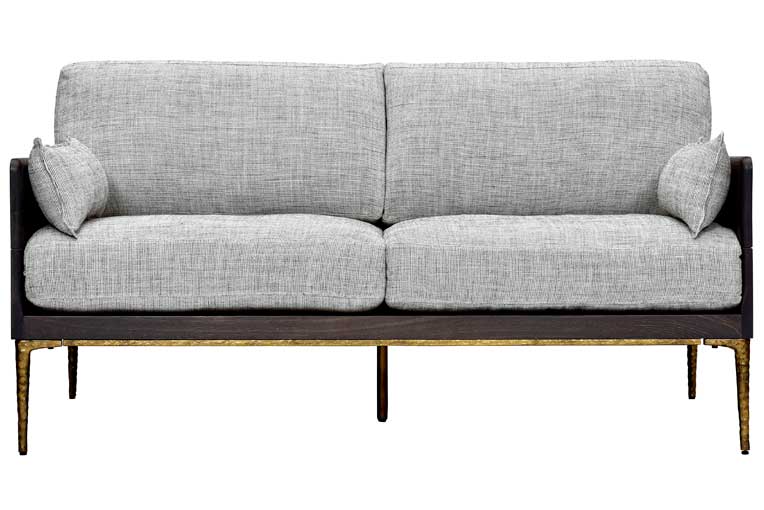 彫刻のような凹凸のある脚部の輝きがアクセントとなっているソファです。形はシンプルながら、フレームや張地、そして脚部まで、異なる質感の重なりが個性豊かに存在感を主張します。