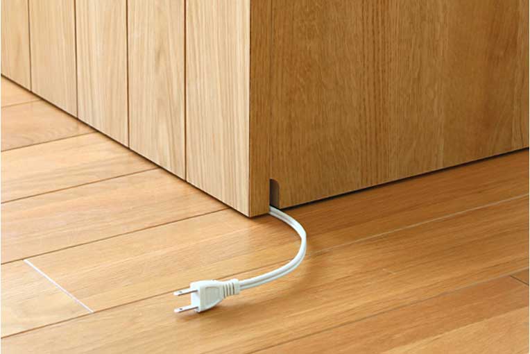 配線がもたつきません。 床接地面のコード穴で配線すっきり。 ※30エンドラックはコード穴は開いていません。