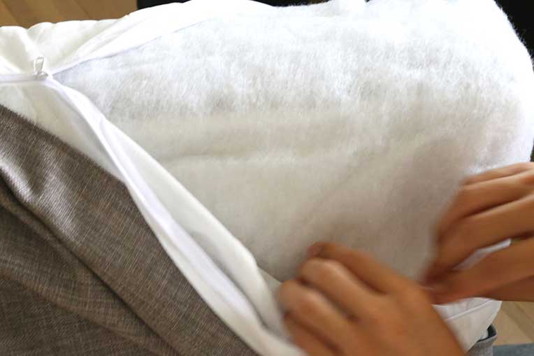 背中のクッションはフェザーと羽毛と同じ柔らかさと 弾力を持ち合わせたシリコンフィルを詰めています。 そのため掛かる重さに合わせて、ゆっくりと身体を 包み込むように背中を支えます。