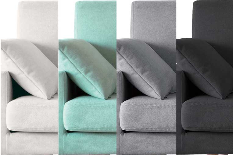 ファブリックは、鮮やかな色彩と清潔感溢れるライトブルー、軽やかな印象のアイボリー、ベーシックなグレー、ダークグレーのさまざまなテイストに合わせやすい4色展開です。