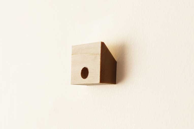 ボックスミラーの背面には、壁掛け用の小口加工があります。斜めに加工しているため、壁掛けフックをしっかりと引っ掛けることができます。壁への取り付けは、壁掛けフックを背面の小口に引っ掛けてください。