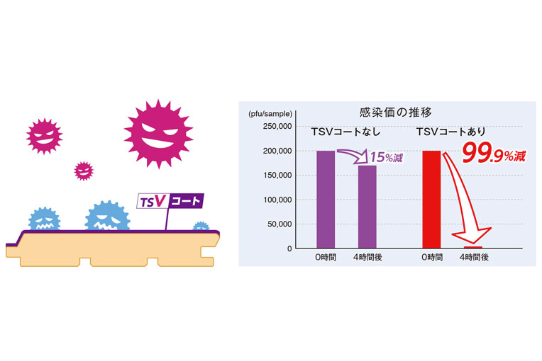 TSVコートはフローリング表面に付着したウイルスを分解して不活性化するので安心です。