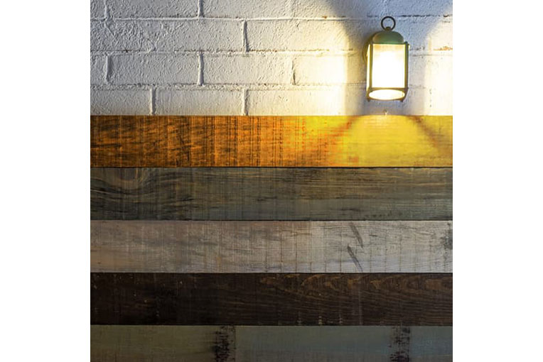木材をあえて日光や風雨にさらして風化させ、シルバーグレイに変色した表面にアンティークを意識した4色の塗装を施した。