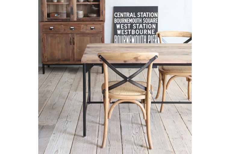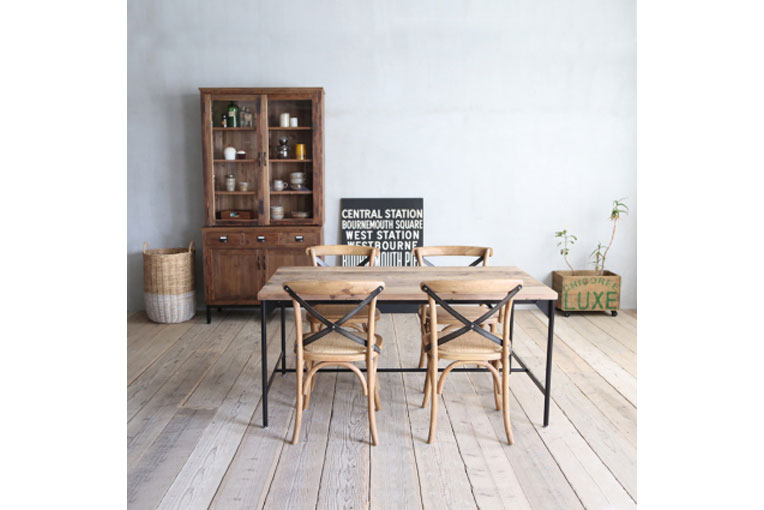 様々な表情をもつパイン古材とスチールを組み合わせたテーブル。使用しているパイン古材は、古材が元々持っている独特の風合いを残すために釘の跡や色ムラをそのままにしています。