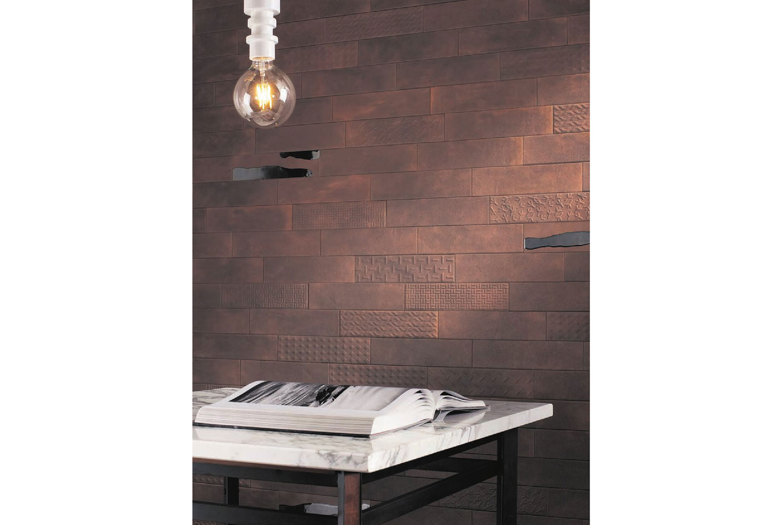 ディストリクトマット面状の温かく落ち着いた色合いと、縞鋼板や叩いて引き伸ばしたような金属板という異素材のデザインが美しいコントラストを生み出します。