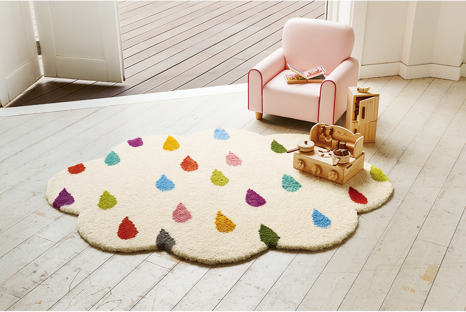もっと気軽にキッズスペースを作れたらいいな。そこで、「ラグを敷くだけでもうそこがキッズスペースに」というご提案。表情豊かなラグで、子どもだけじゃなく大人もご機嫌。