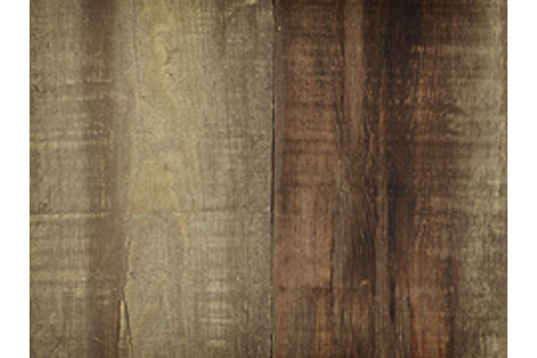 この深いエッチングは、まさに過ぎ去りし時を表しています。一方、ブラウン色にわずかにグレイ色が入った裏面もアンティークな独特の風合いを持っています。樹種はホワイトパイン、シダーが中心です。