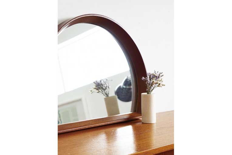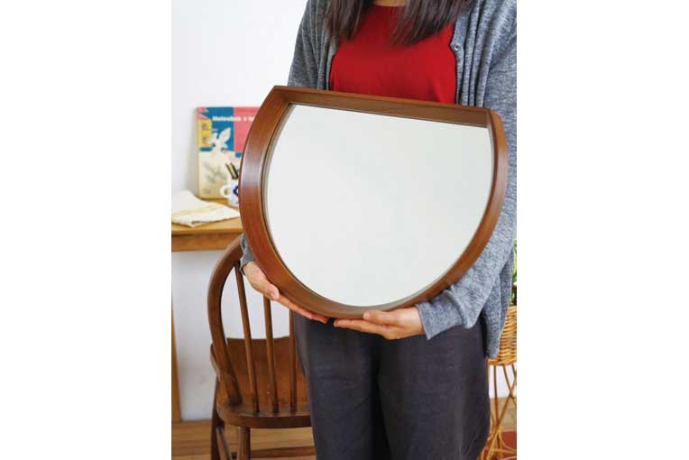 デンマーク語で「曲線/カーブ」という意味の「kurve(クルベ)」、その名前の通り曲線が美しいミラー。北欧デザインを思わせる、シンプルで木の質感を生かしたフレームが立体的に鏡部分を縁取ります。