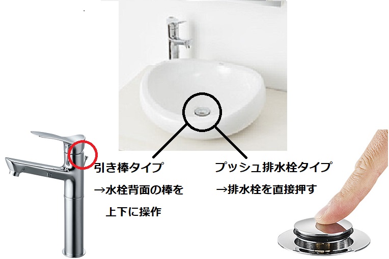 【引き棒】混合栓の後ろについている引き棒を操作することで、洗面ボウル内に水溜め、排水ができます。