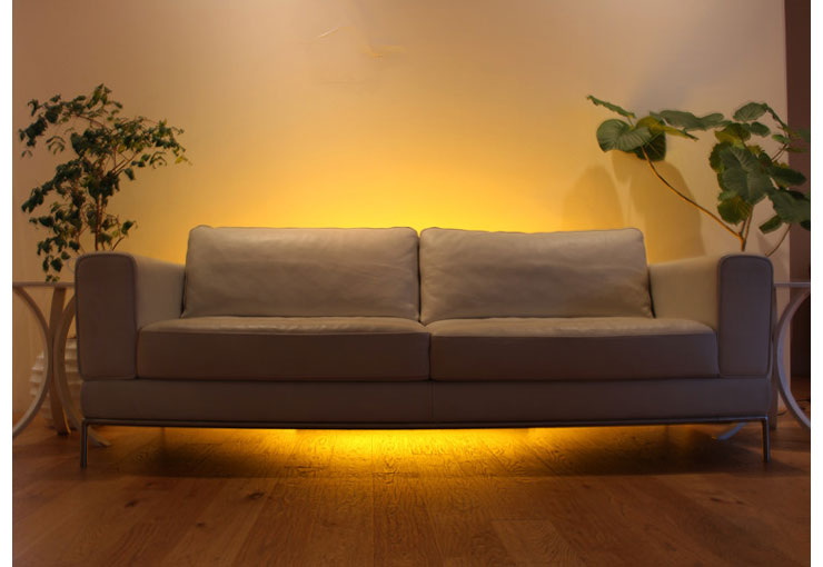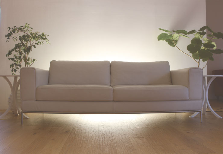 横置きでソファの後ろにセットすると、空間に奥行きが生まれ、まるでソファが浮いている様な感覚になる光の効果も楽しめます。