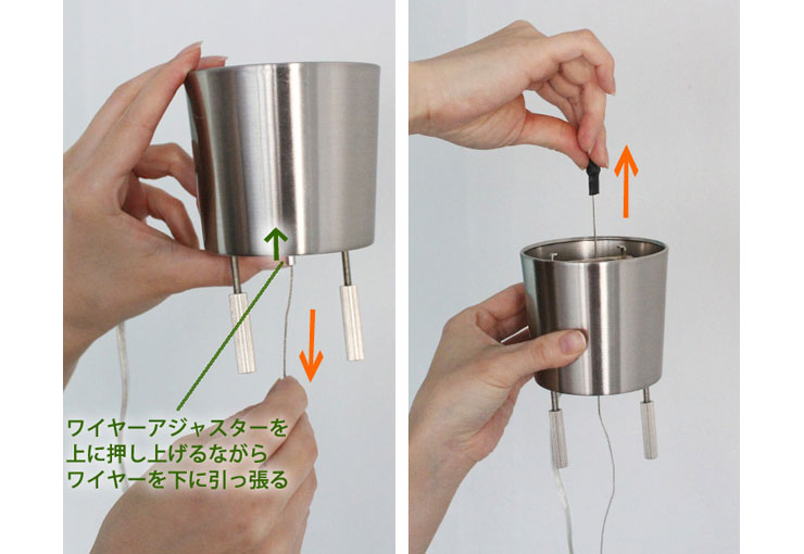短くする場合には、フランジの中から そのままワイヤーを引き上げます。(画像:右)