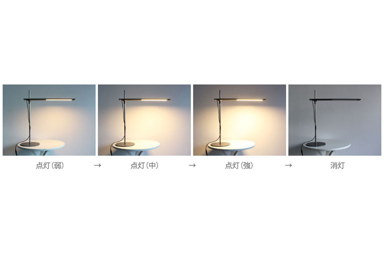 上部にタッチセンサー式の調光ボタンスイッチ付き。 ボタンスイッチを押す毎に、上の画像のように明るさが切り替わります。